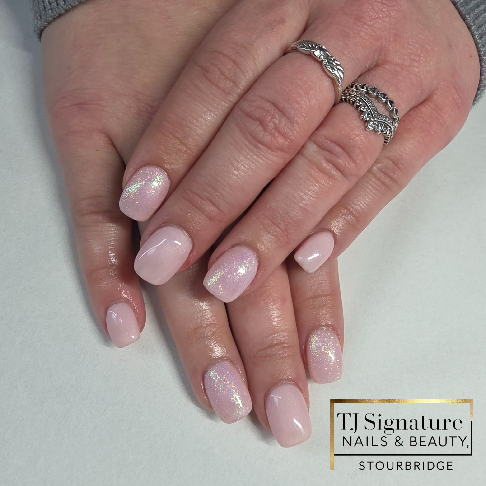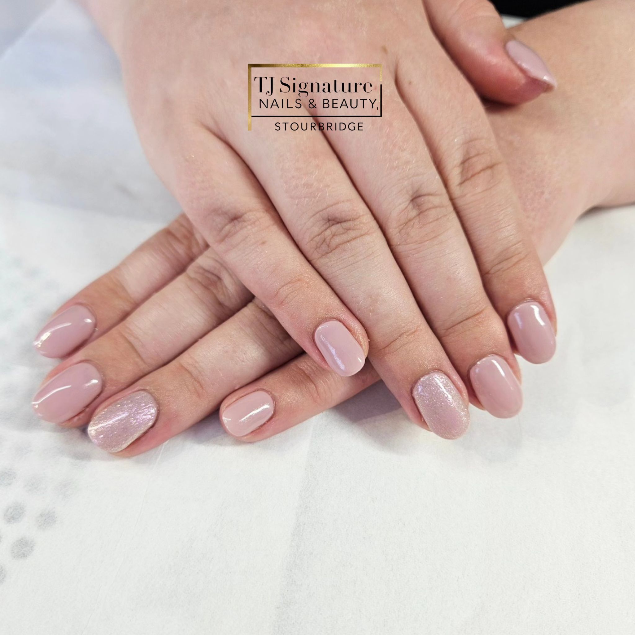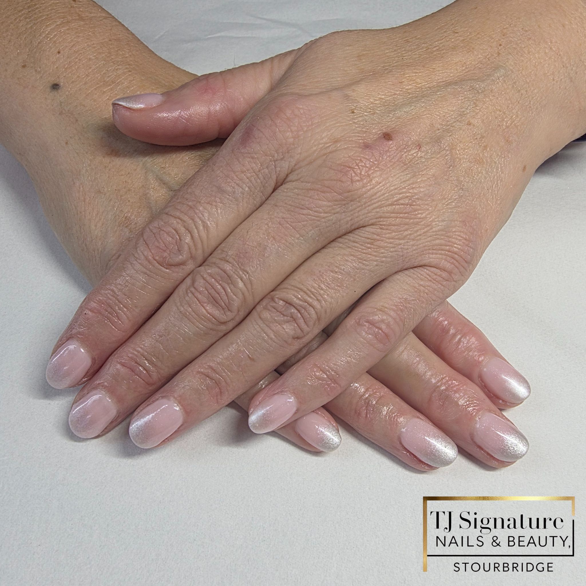 A natural blush base finished with a subtle iridescent shimmer — elegant, timeless and perfect for clients who love a clean, feminine look.