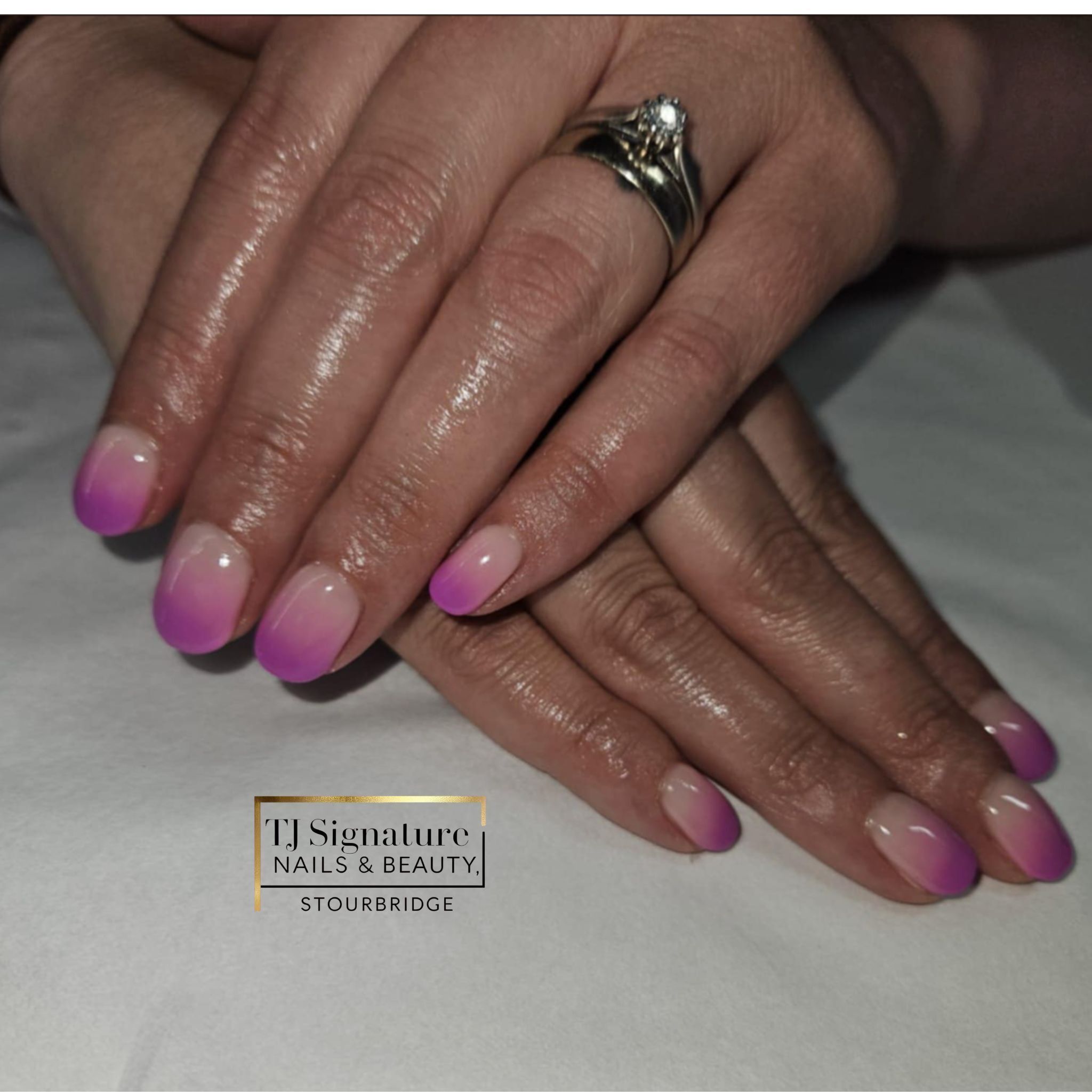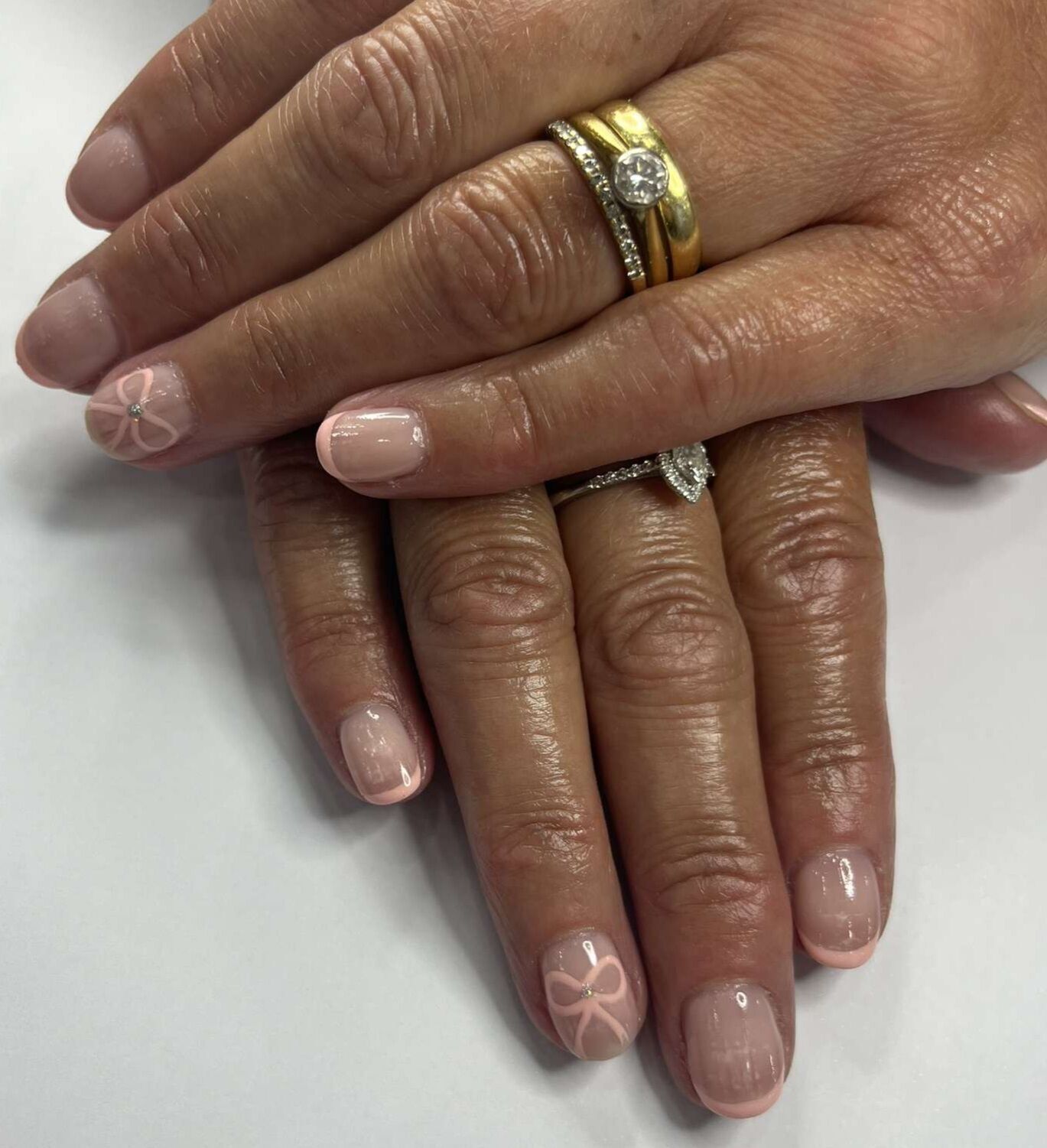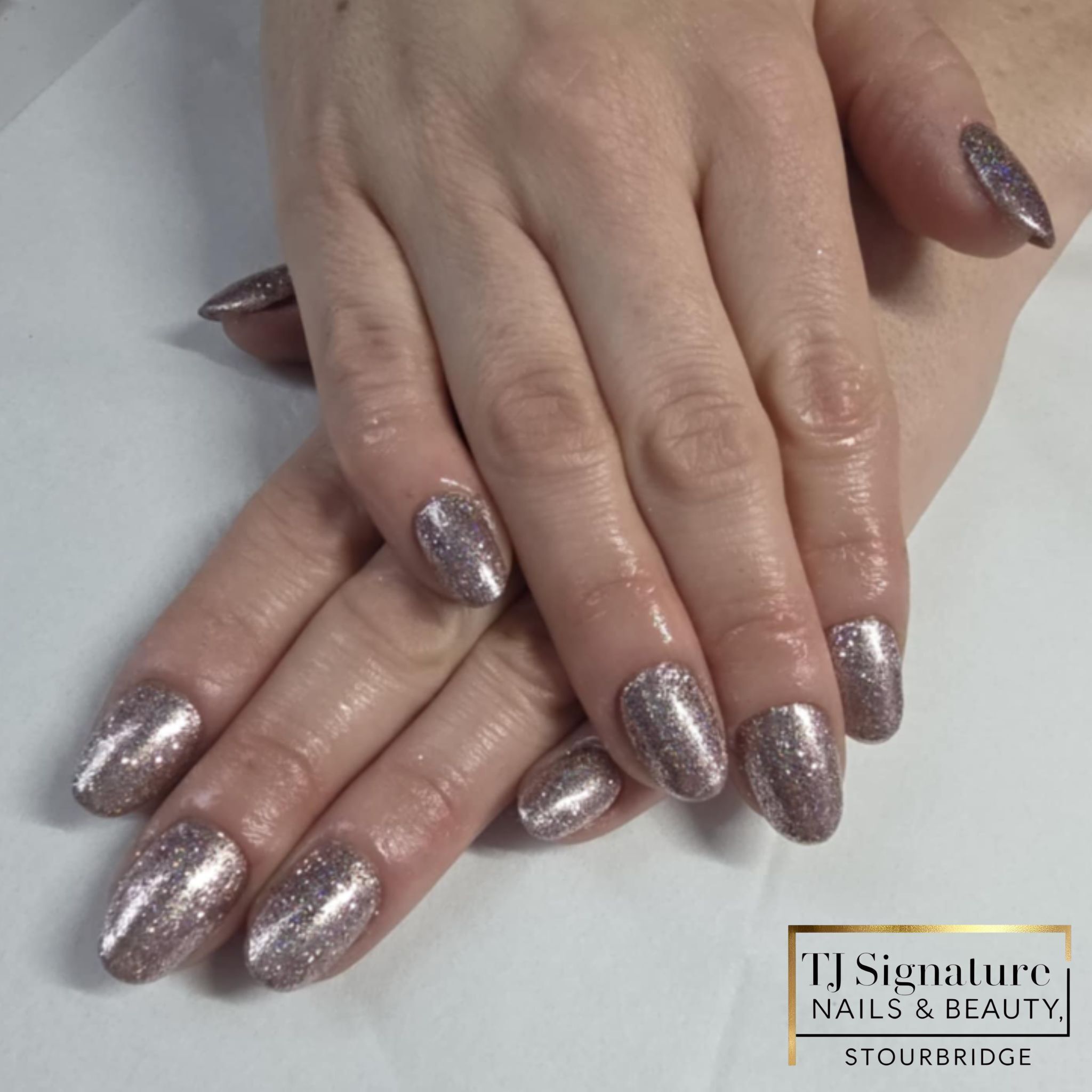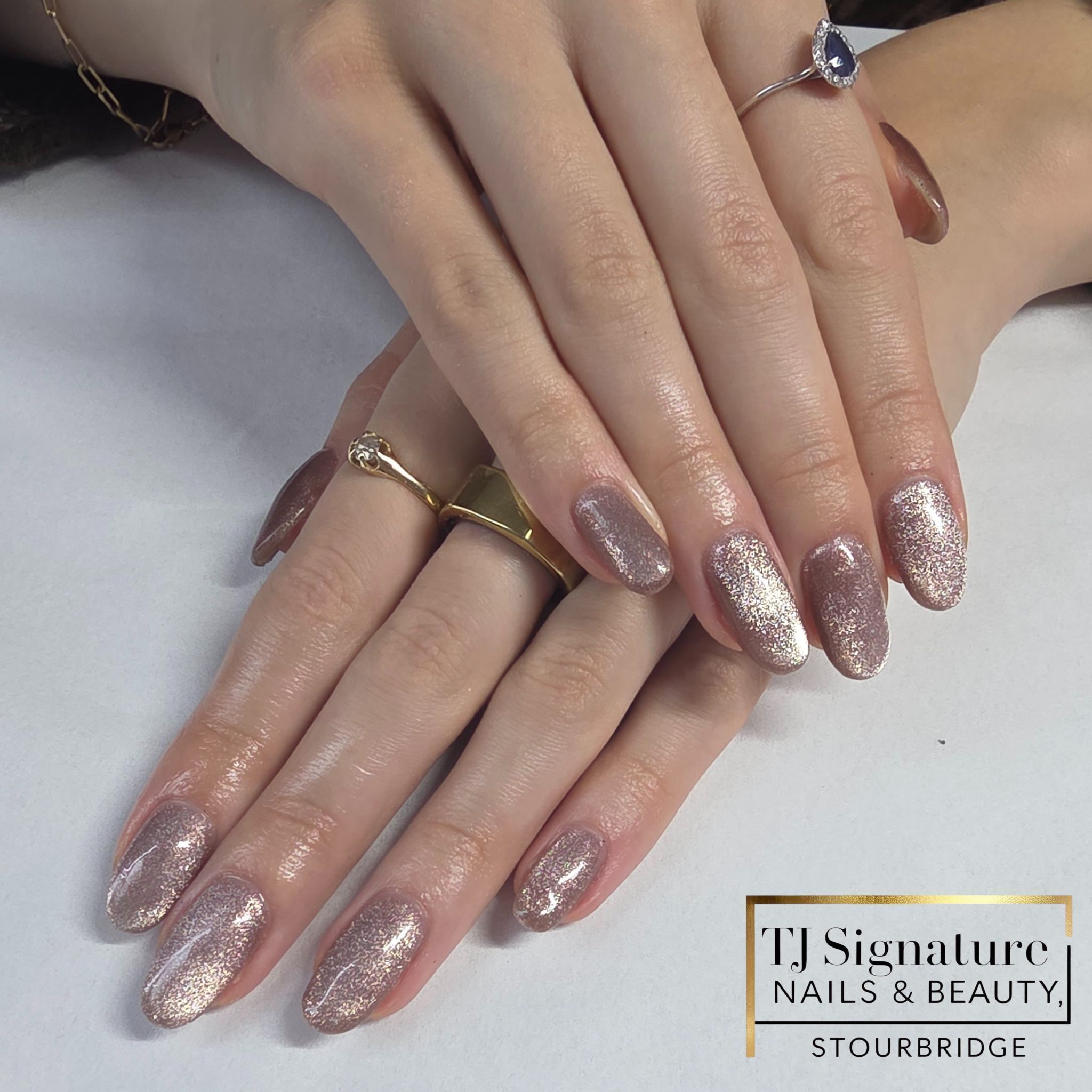 A natural blush base finished with a subtle iridescent shimmer — elegant, timeless and perfect for clients who love a clean, feminine look.