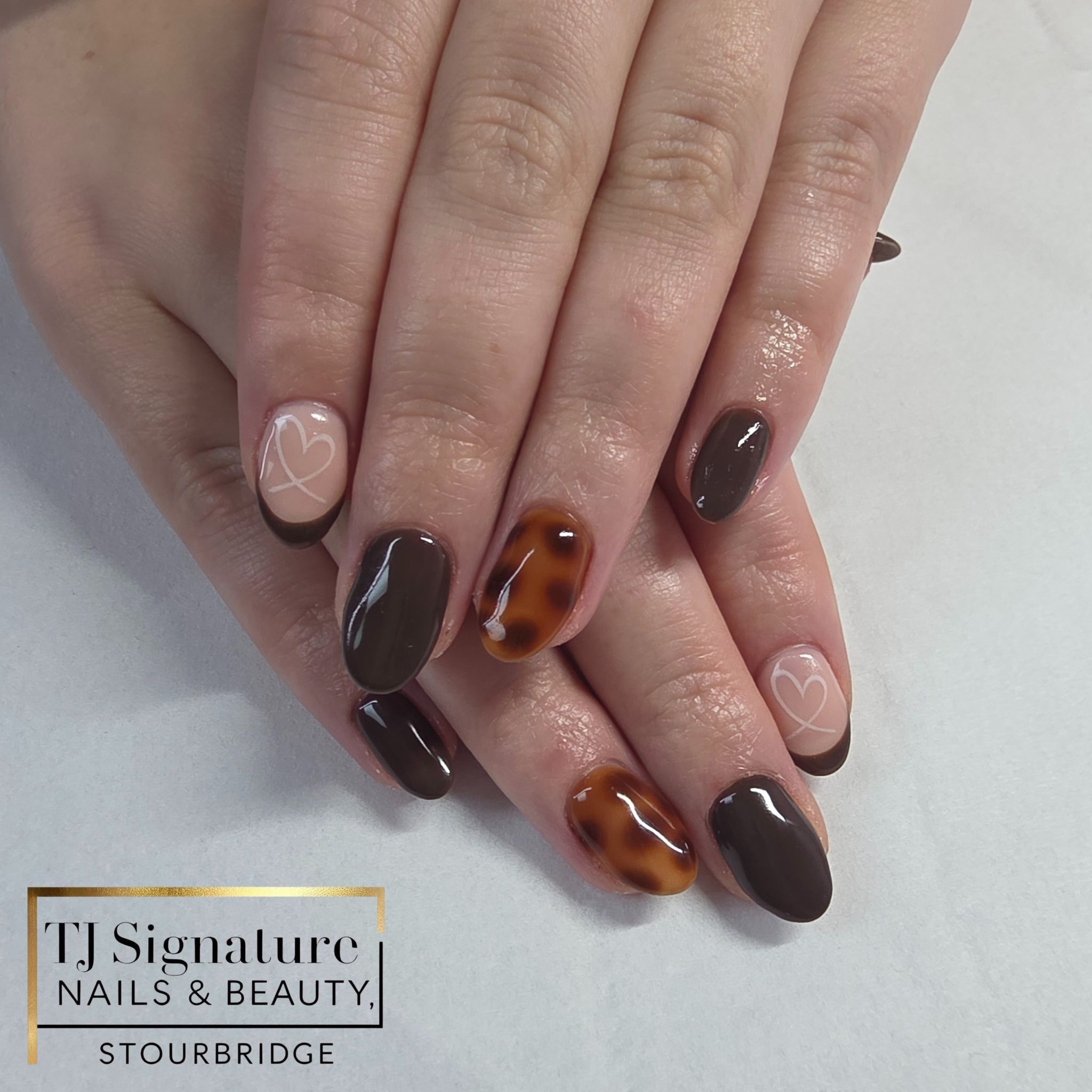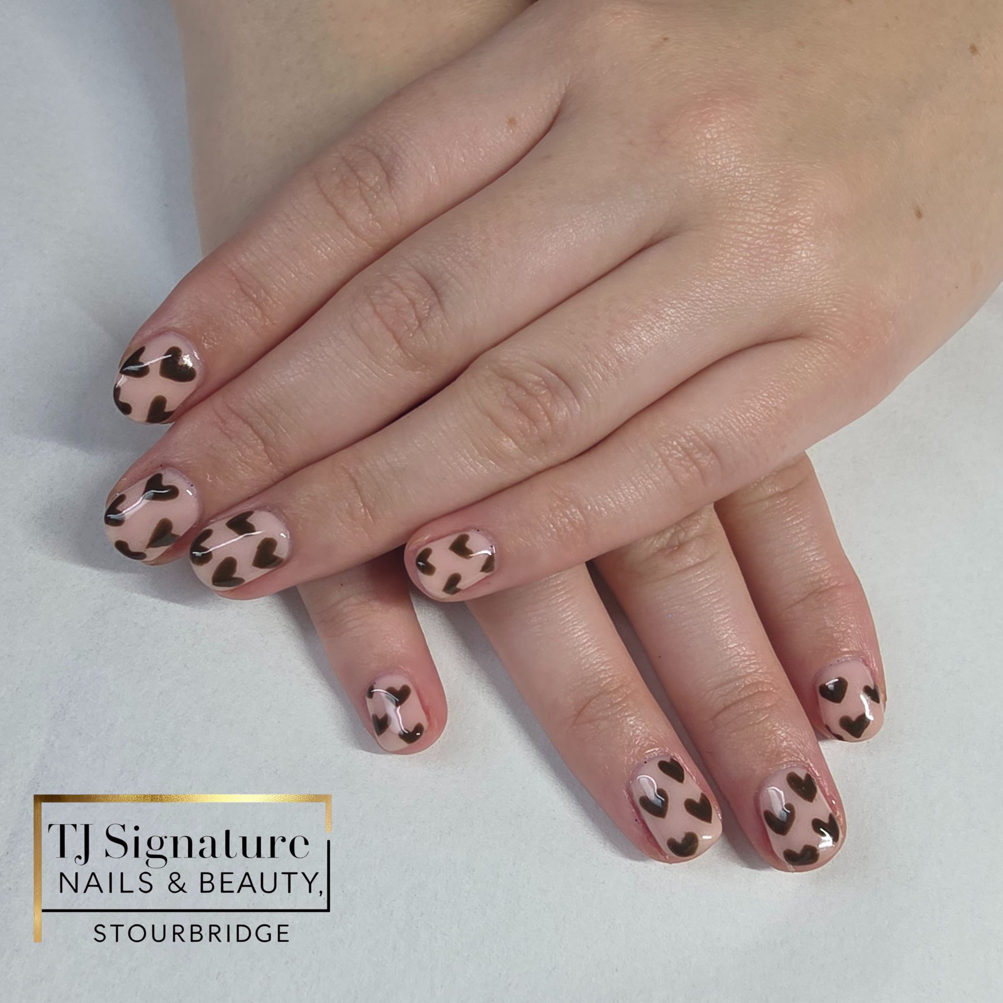 Soft nude builder base topped with glossy chocolate hearts — simple, sweet, and full of charm. Perfect for everyday wear or a little love-inspired set any time of year 💗
