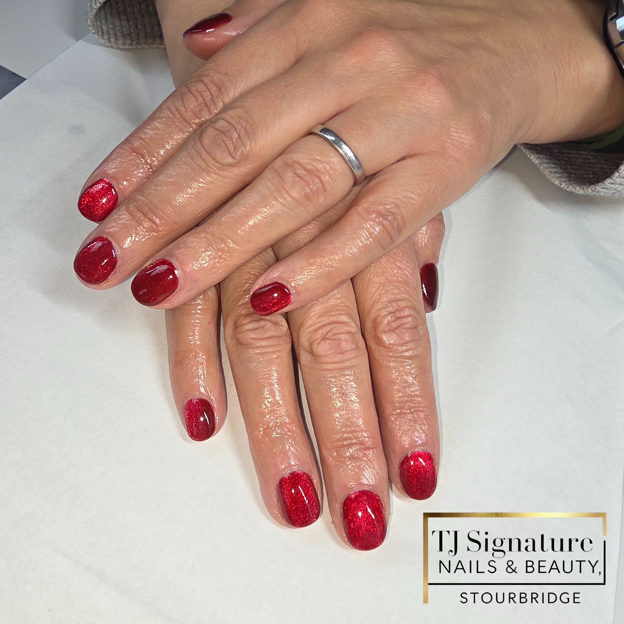 A timeless gel manicure featuring rich ruby red tones with a subtle champagne-gold glitter accent. Elegant, glossy and perfectly finished for a classic festive look.