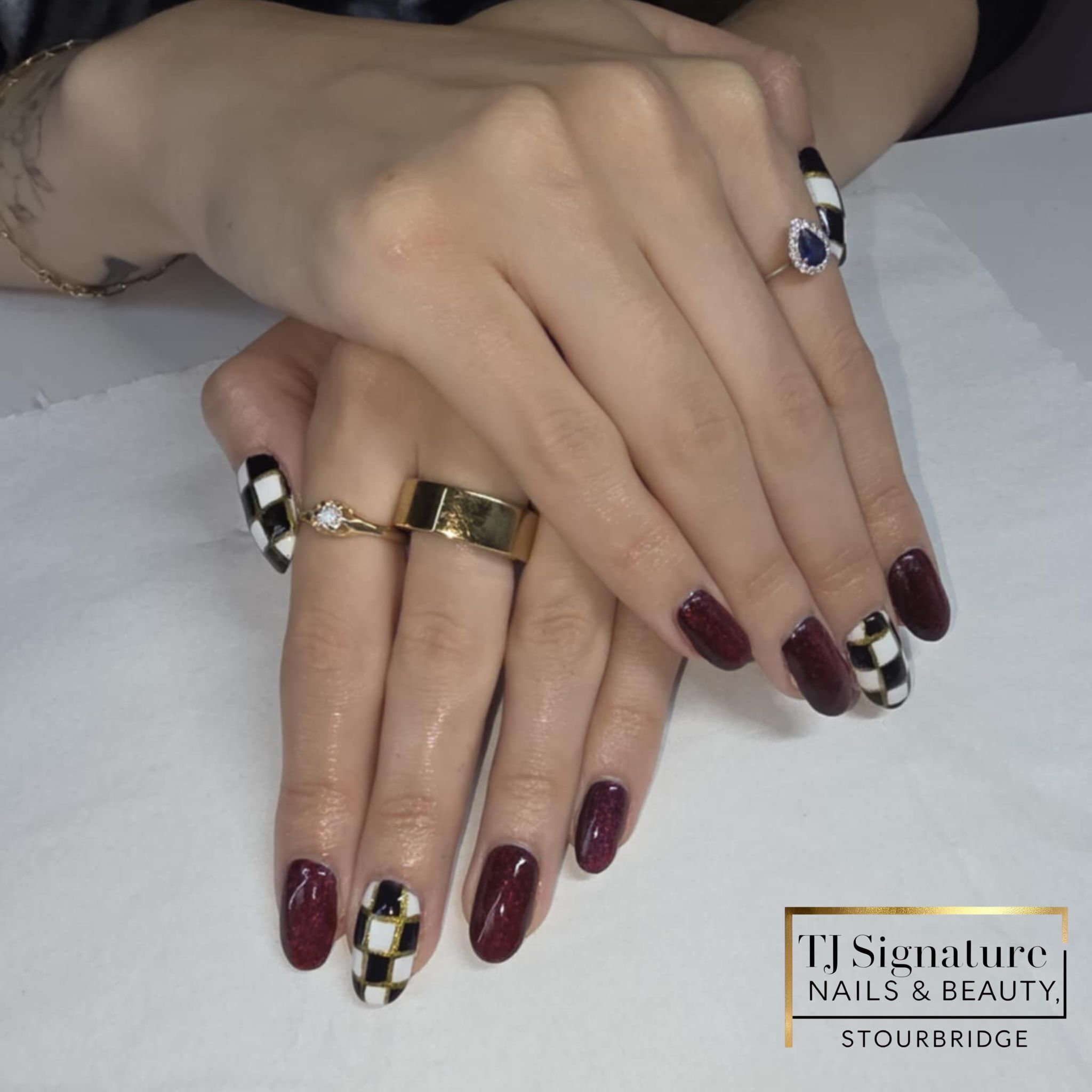 Berry & Gold Christmas Nails A glossy berry blend with festive gold accents and hand-painted detail — a chic seasonal look.