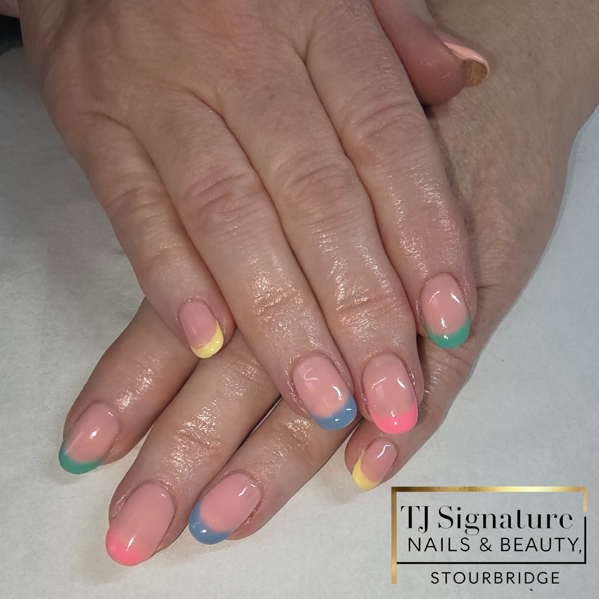 A soft nude base with pastel French tips, combining classic elegance with a subtle pop of colour — perfect for any season.