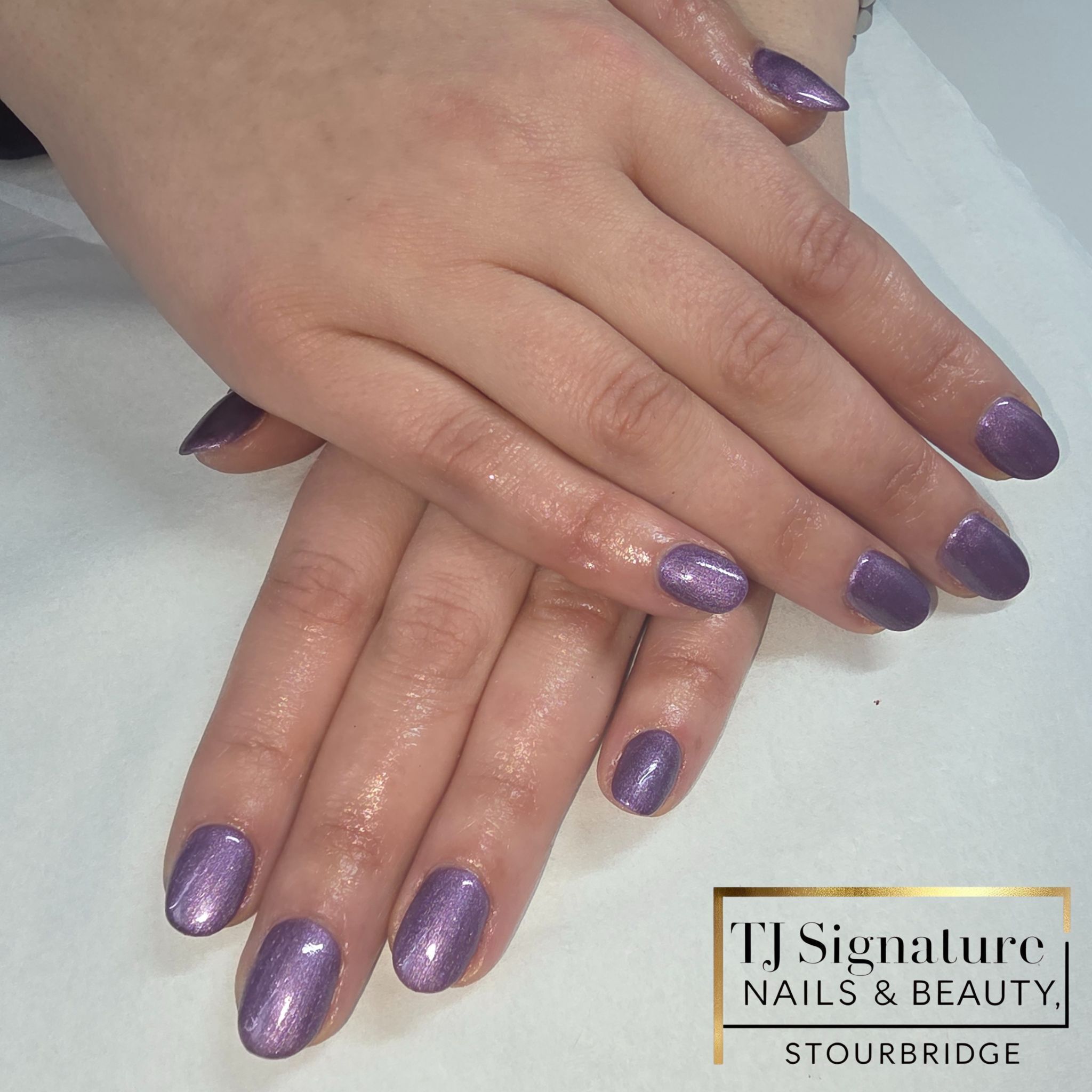 Natural nails enhanced with an acrylic overlay for extra strength, as an alternative to builder/BIAB, finished with a cat-eye effect that shifts beautifully in different lighting.