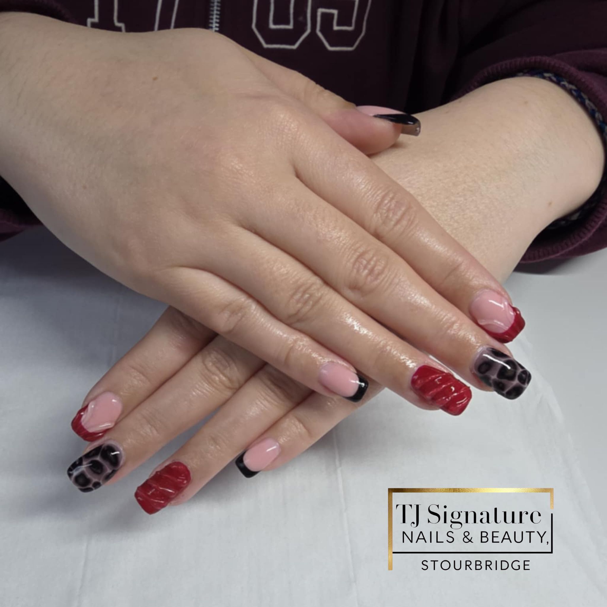 Red and black statement nails with animal print and glossy detail. A bold, confident mix of colours and textures for those who love a standout look.