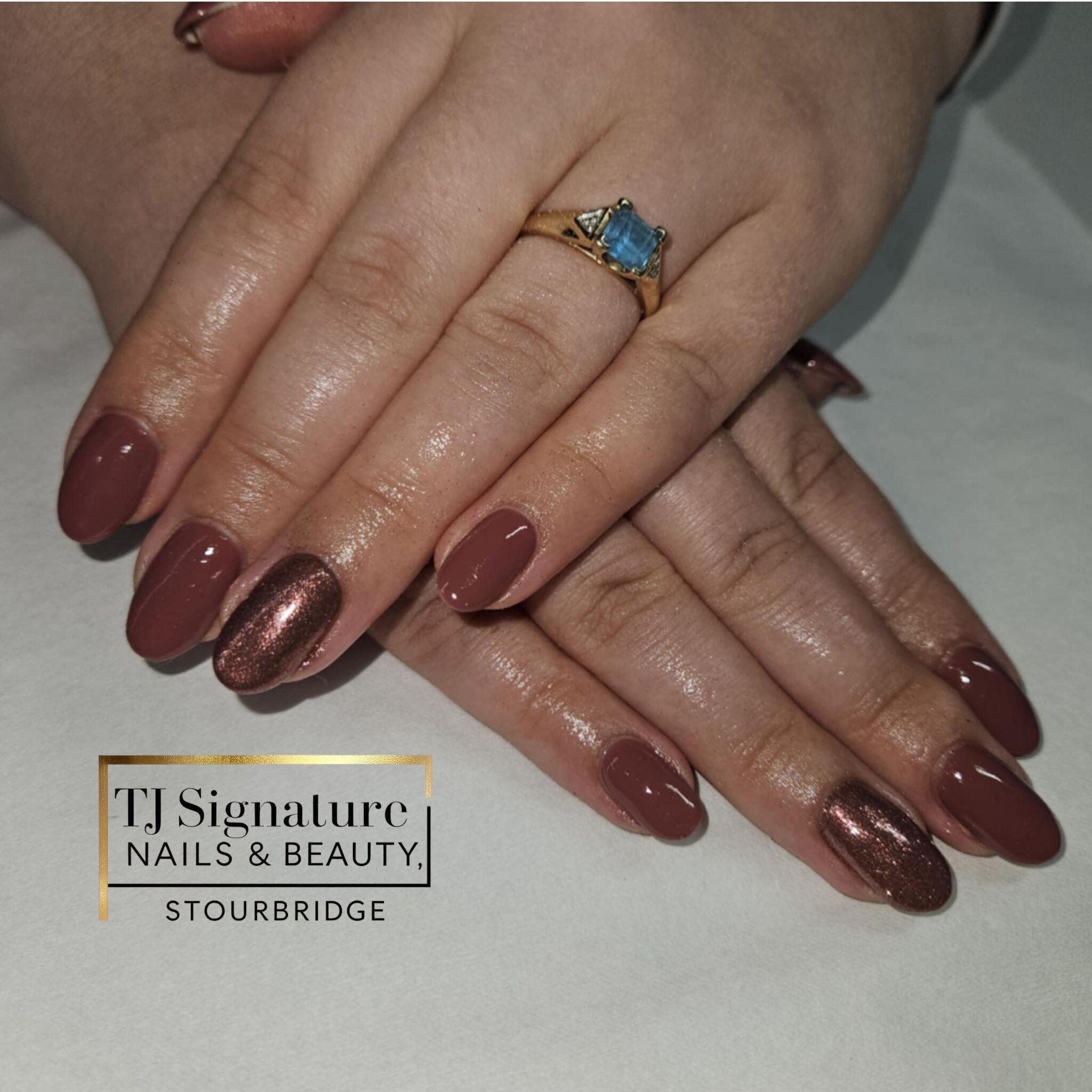 Rich and classy — this set pairs a warm mocha brown with a shimmering bronze accent nail for a look that’s perfect for any season. ✨🤎