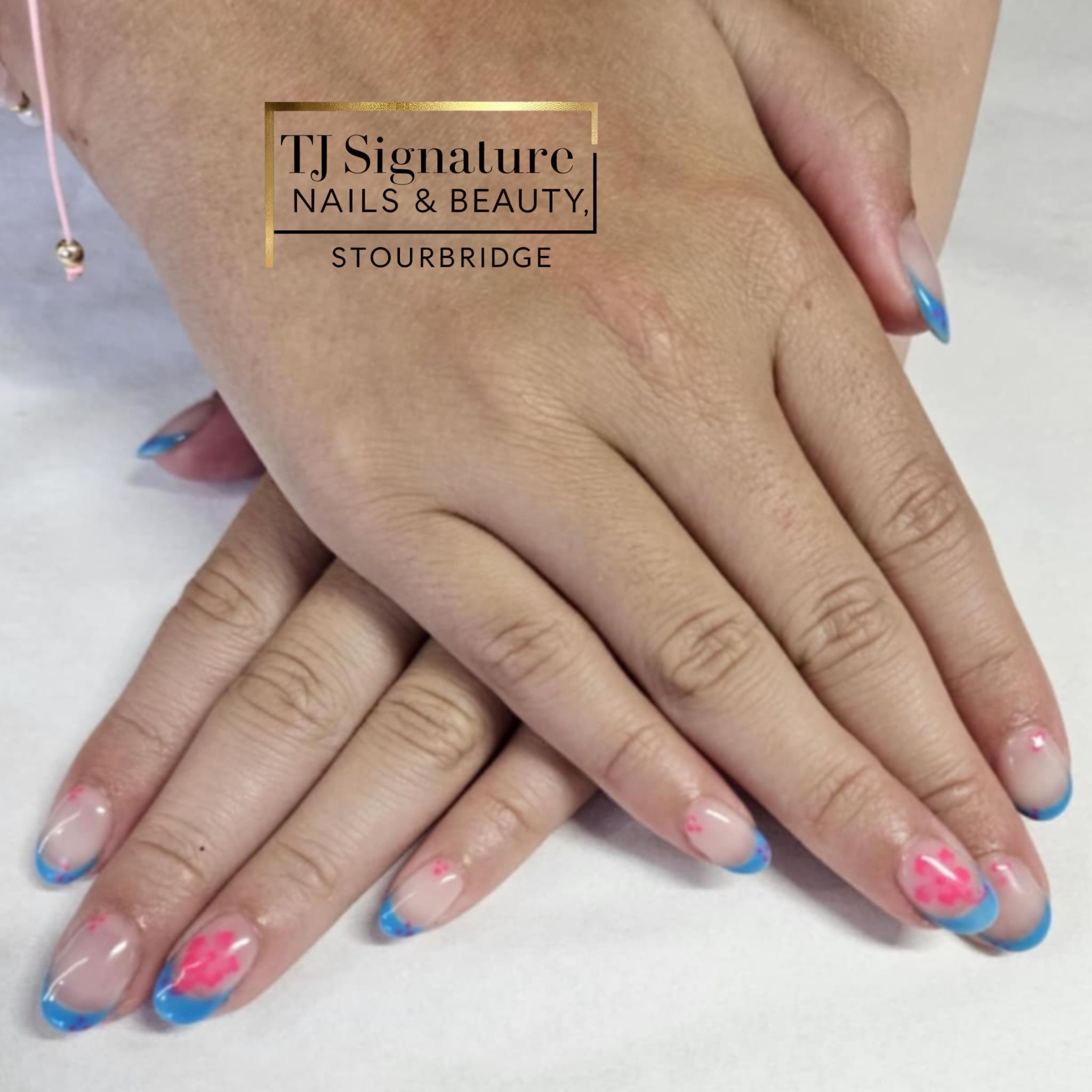 Bright blue French tips with playful pink floral accents. Gel over natural nails.