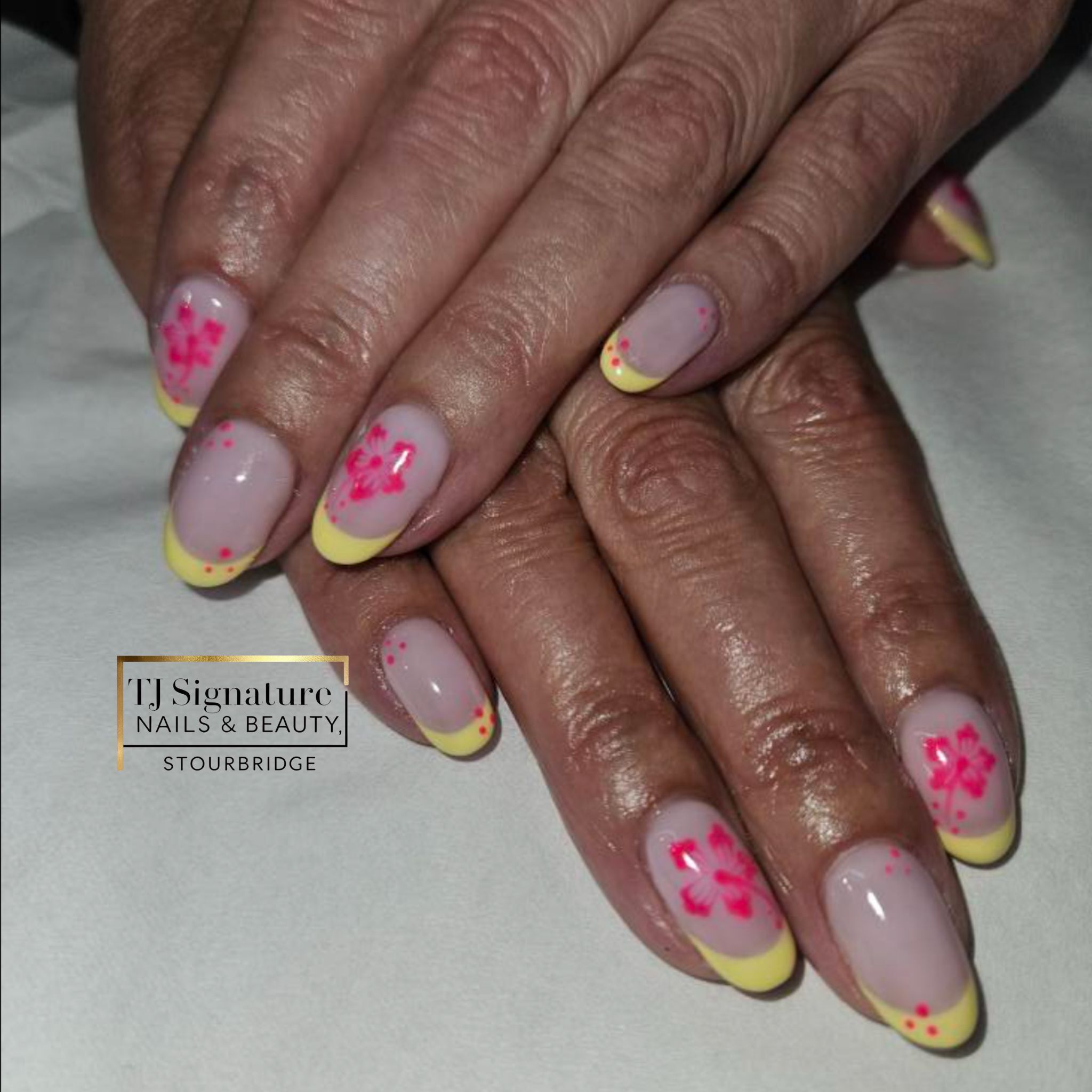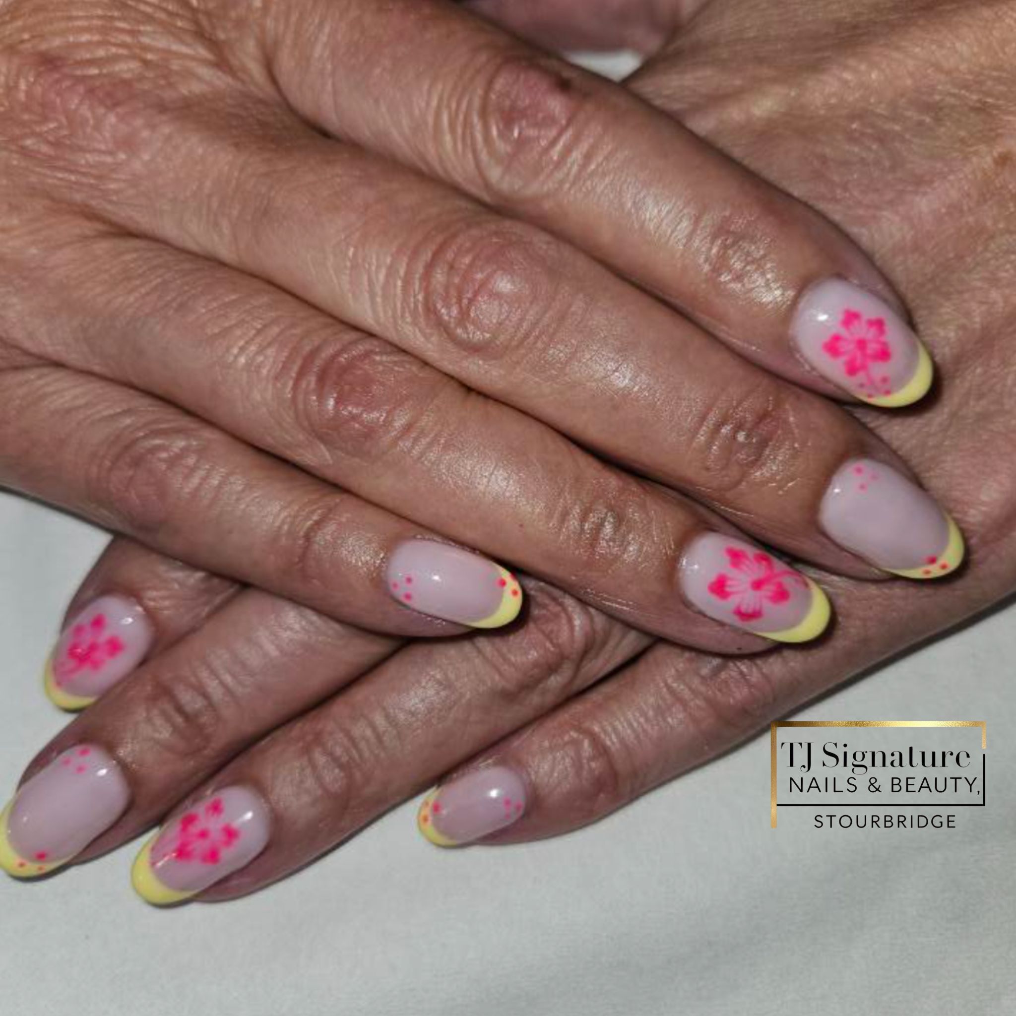 Another beautiful freehand nail art with a fresh summer vibe — soft pink base, yellow French tips, and delicate hand-painted hibiscus flower's 🌺 💅✨