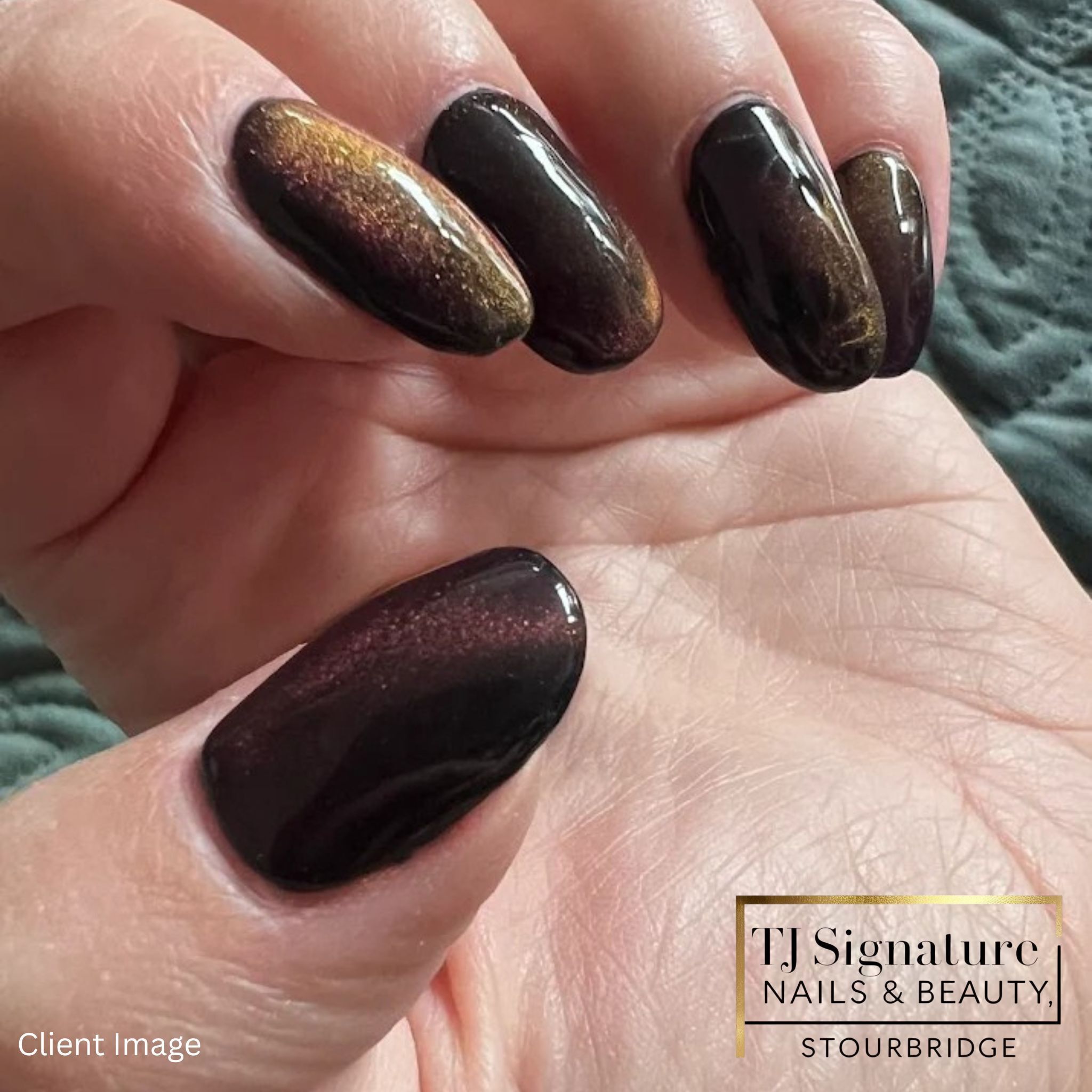 ✨ Client Image ✨ Cat-eye polish over builder gel — the same set captured in two different lights. Rich tones shift and shimmer beautifully, showing just how stunning this effect can be.