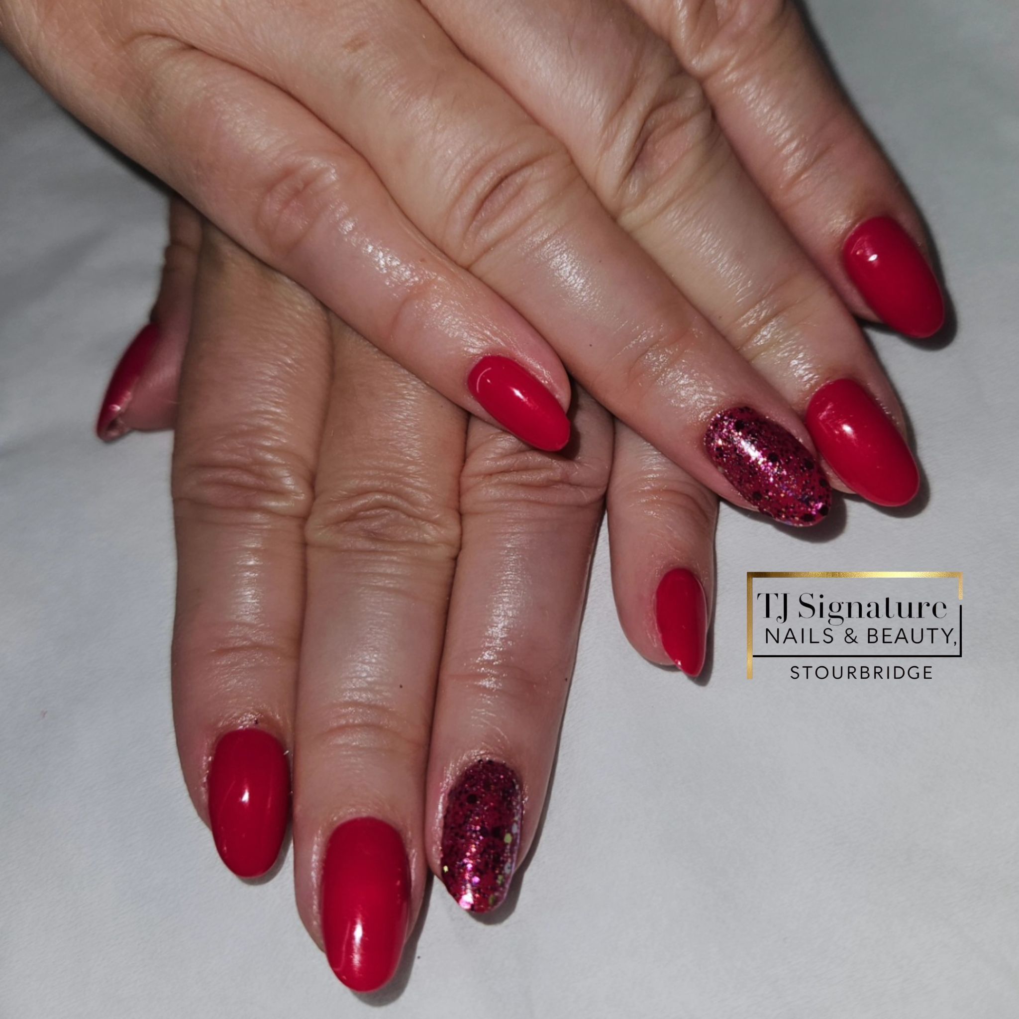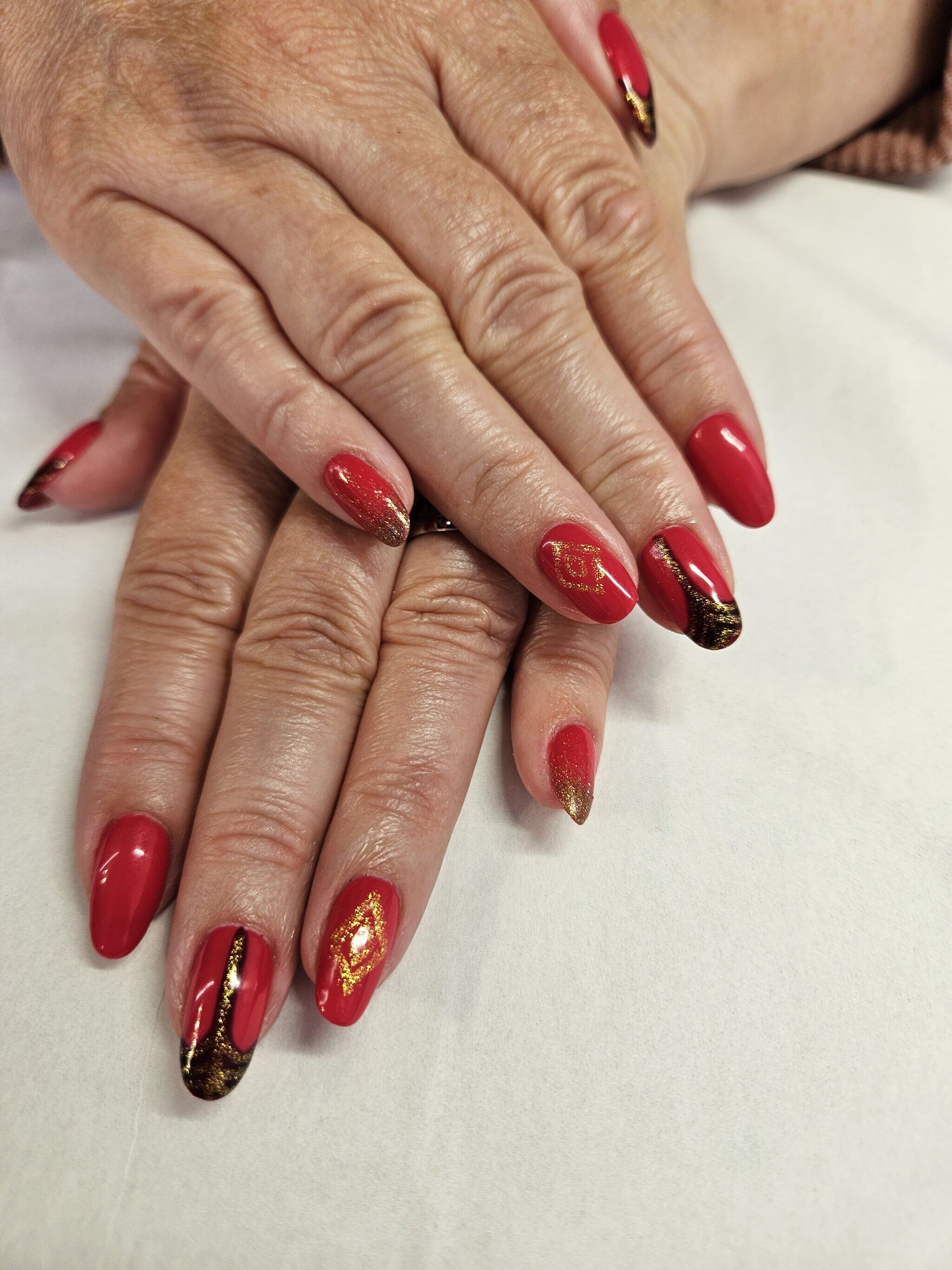 A festive gel manicure featuring rich ruby and metallic red tones, finished with a soft champagne-gold glitter accent. Glossy, elegant and perfect for a classic Christmas look.