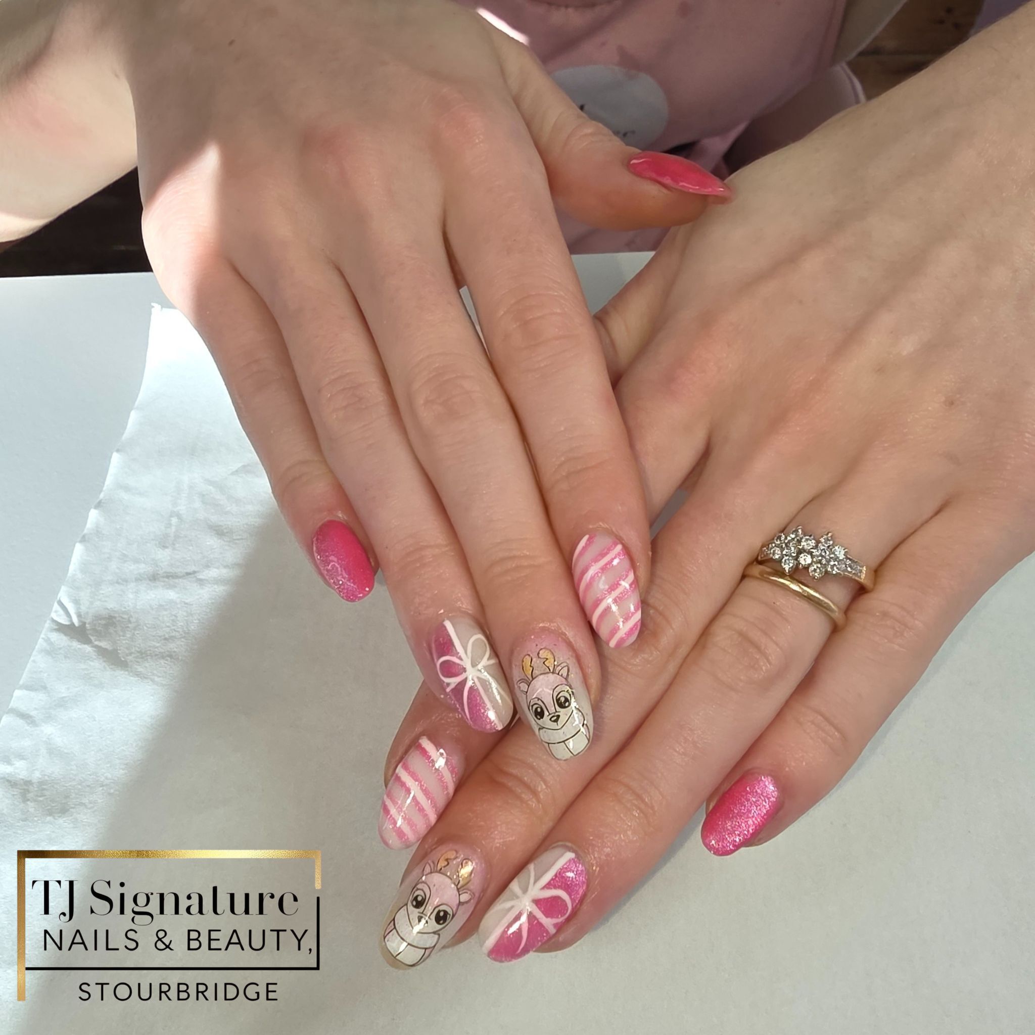 A festive Christmas set with red chrome, candy-cane stripes and snowy sparkle — one of the gorgeous seasonal designs created during a very busy week in the salon.