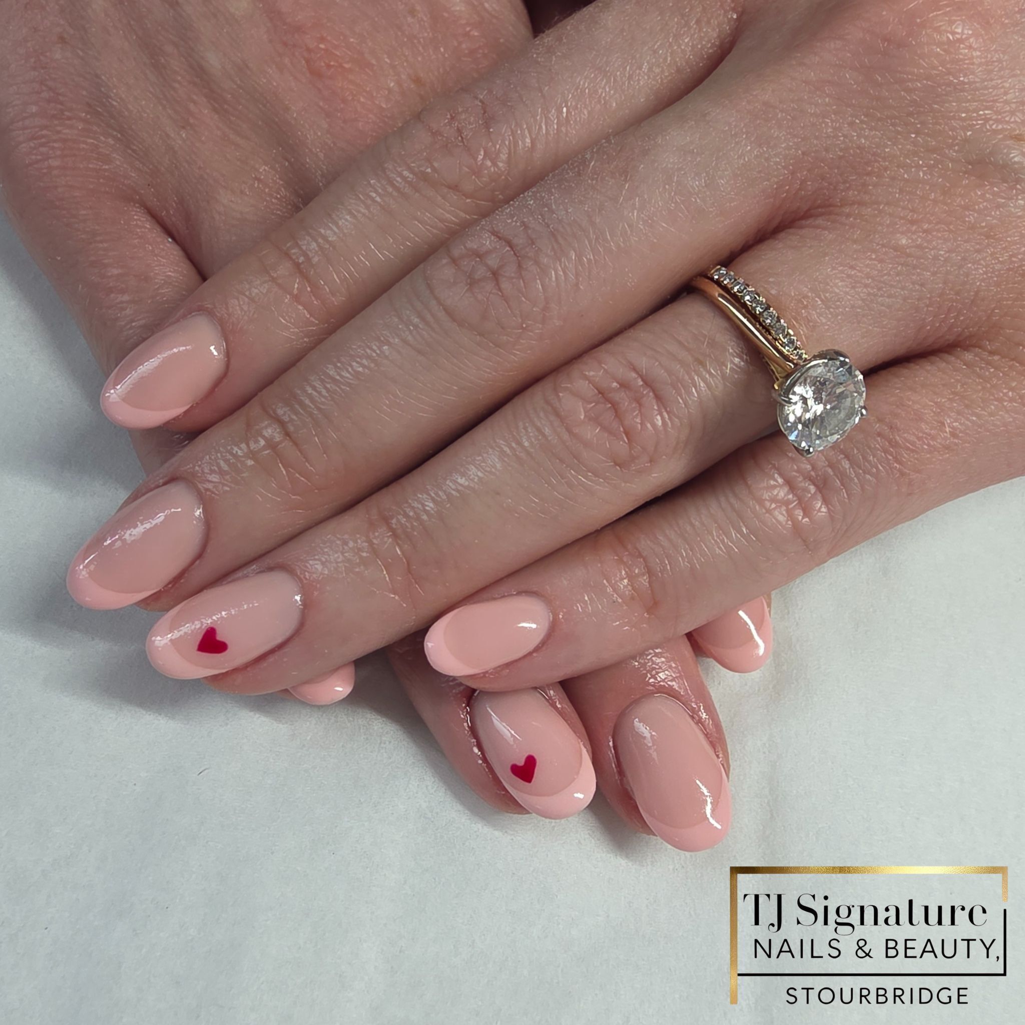 Soft blush nails with a delicate French tip and heart detail – perfect for Valentine’s or an elegant look any time of year.