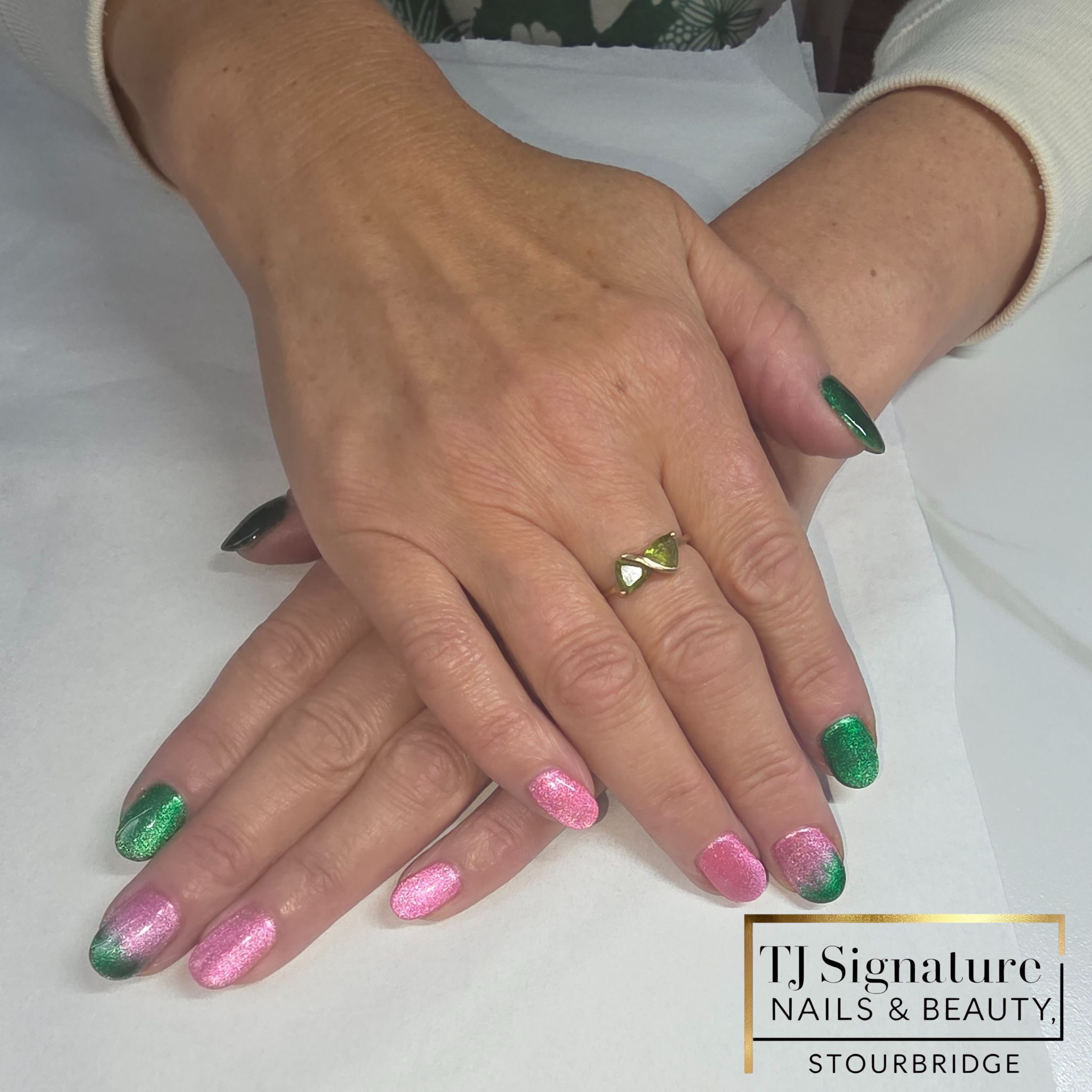 Festive Pink & Green Cat-Eye Builder gel (BIAB) with a shifting festive cat-eye finish and they had matching toes for a full coordinated look.