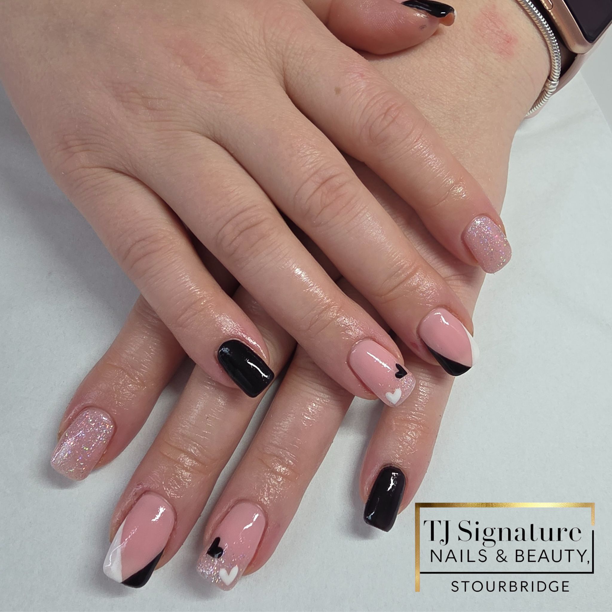 A soft pink base paired with bold black accents and delicate hearts, finished with a touch of sparkle — a cute and modern mixed design.
