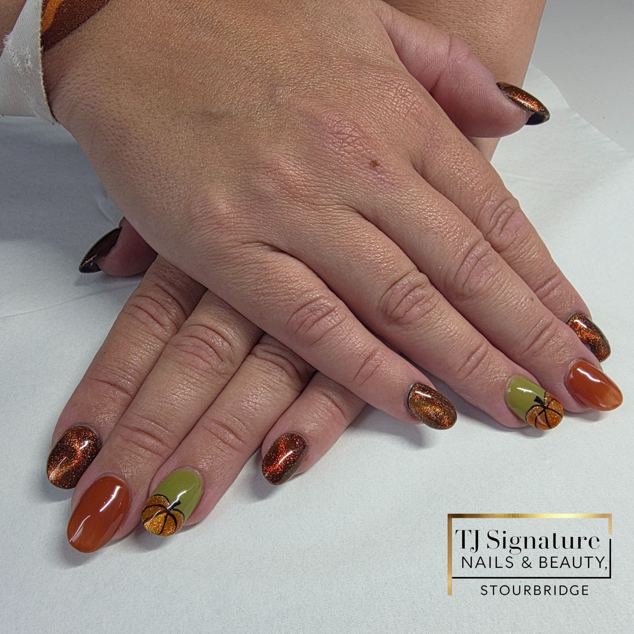 Warm autumn tones with a shimmering cat-eye finish and cute pumpkin details, created over a builder gel base for strength and natural growth.