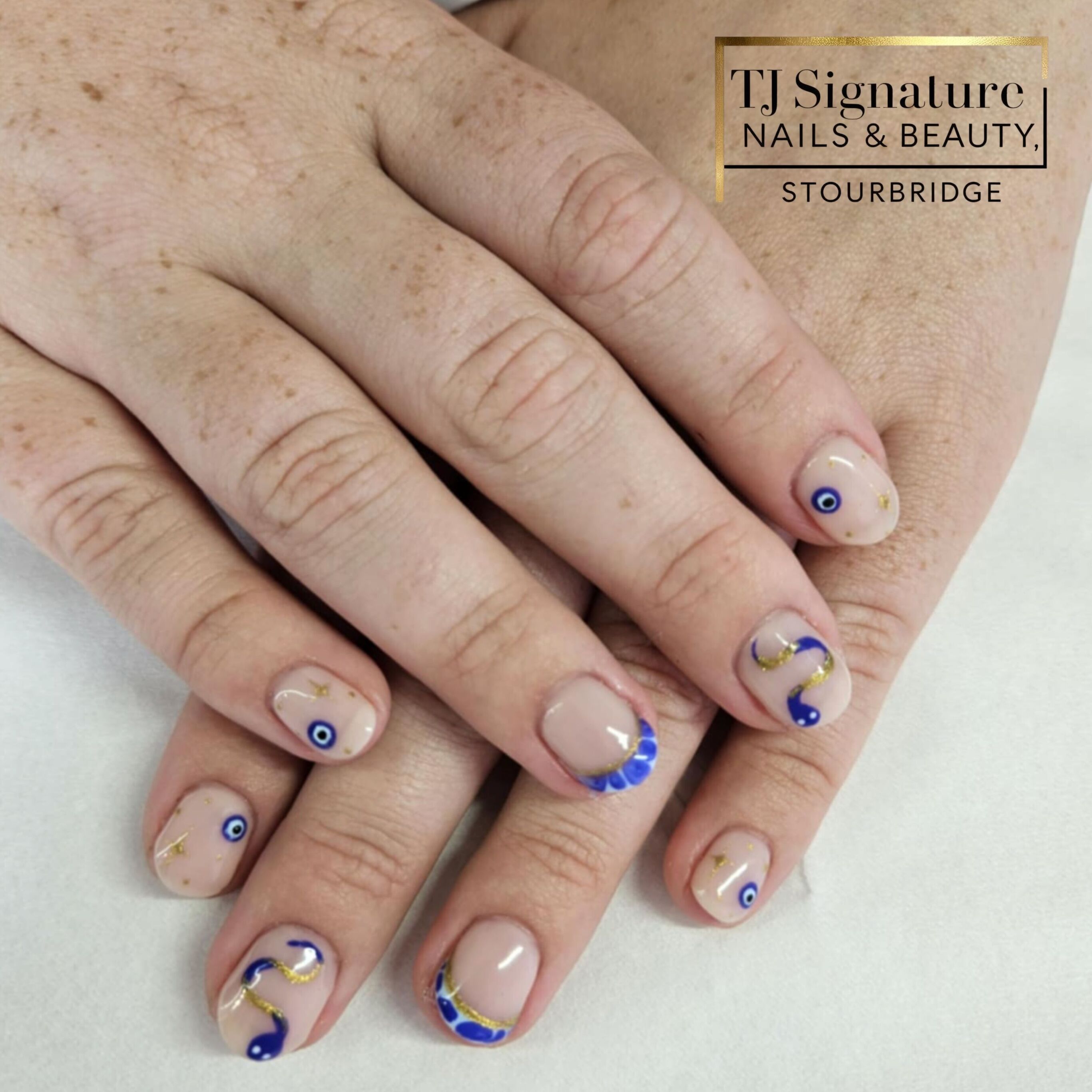“Mamma Mia” inspired — a soft nude base with hand-painted cobalt blue evil eyes, shimmering gold accents, and a bold blue-and-gold snake for that perfect Mediterranean summer vibe.
