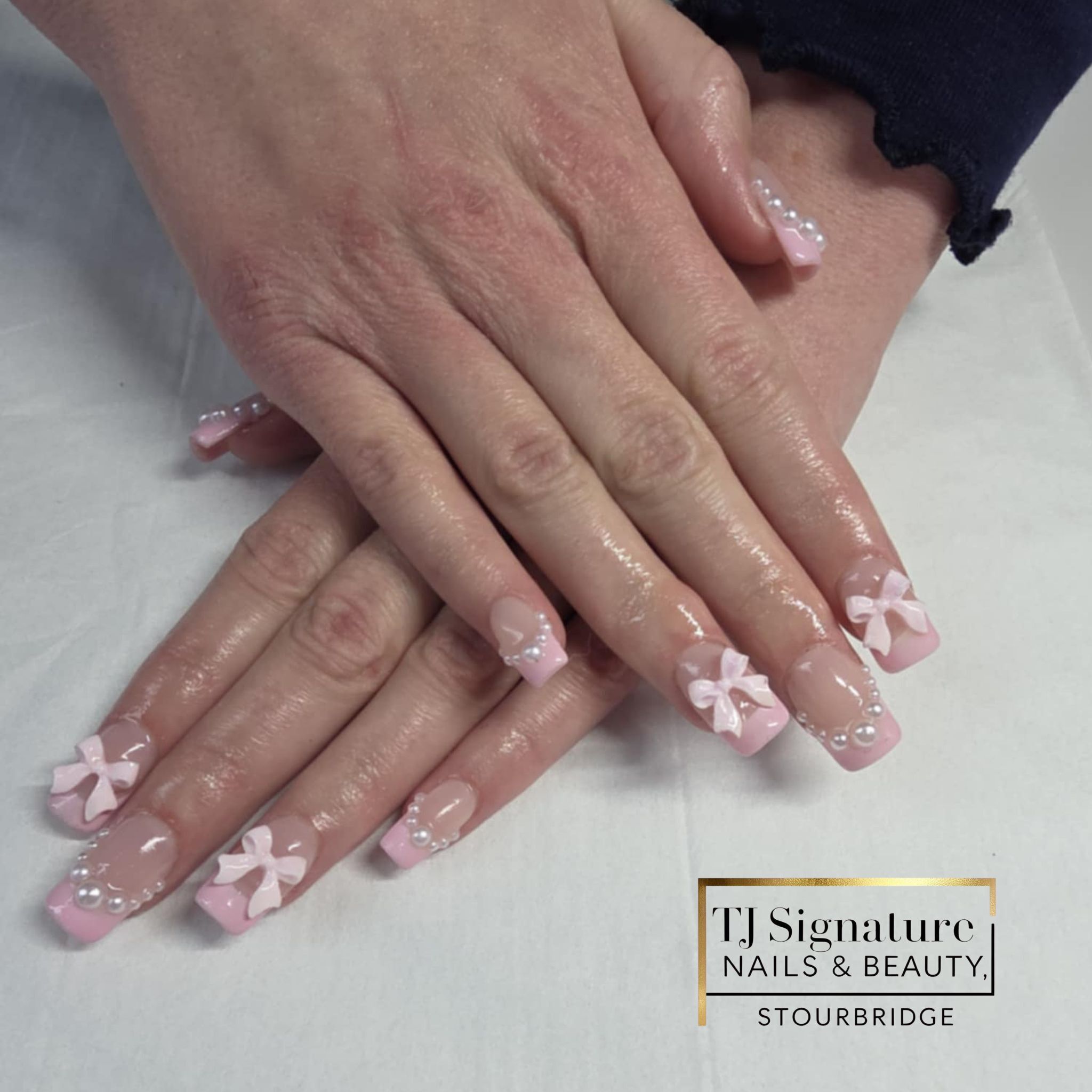 Soft pink French nails with 3D bows and pearl accents. A delicate, feminine design that blends elegance and charm – perfect for any occasion.